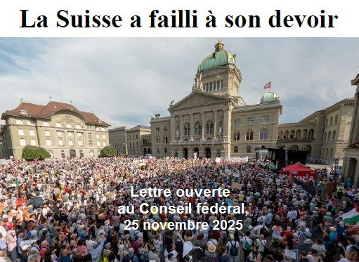 > Une nouvelle forme de domination coloniale, Yara Hawary, 20.11.2025 > Le Conseil de sécurité punit la victime et récompense le criminel, Craig Mokhiber, 19.11.2025 Témoignage: lettre de Ziad Medouk, resté dans le nord de la bande de Gaza, 23 juillet 2025 Après l'épisode de l'UNRWA, une nouvelle page honteuse de l'histoire suisse s'écrit. Souscription en faveur du « Centre d'éducation communautaire » à Dahria. vidéo de al Saraya, une association de Jérusalem, parmi d'autres, que soutient le Collectif |